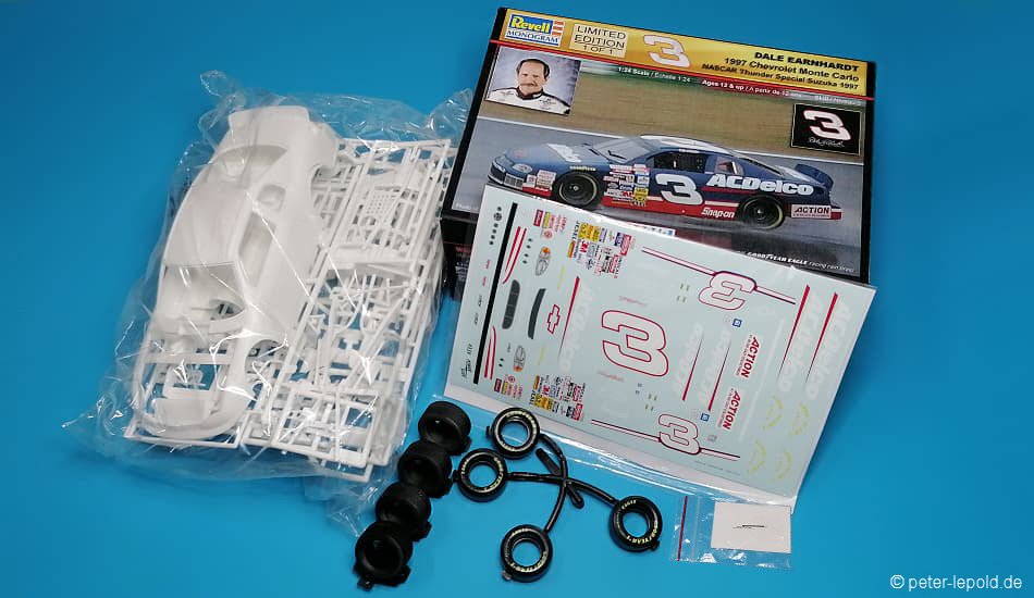 Vor einer Weile hatte ich meine selbstentworfenen Dale Earnhardt Schachteln kurz vorgestellt. Beim 1997 ACDelco waren mir eine selbstgemachte Schachtel und Aftermarket-Decals aber nicht genug. Das von mir verwendete Schachtelbild zeigt den ACDelco bei klatschnasser Rennstrecke, denn während des Trainings sowie Qualifying beim 1997er NASCAR Thunder Special in Suzuka regnete es immer wieder und es wurden zum ersten Mal Regenreifen verwendet. Mein Bausatz sollte ein absolutes "1 of 1" werden, aber dazu brauchte ich Good Year Eagle Regen Rennreifen im Maßstab 1:24. Diese gibt es jedoch nicht...kein Zubehör-Hersteller hatte sich bisher dem Thema Regenreifen für NASCAR Modelle angenommen (und dabei fährt NASCAR seit einigen Jahren auf Rundkursen wie Watkins Glen, Road America oder Sonoma auch bei Regen). Kurze Rede, langer Sinn...ein guter Modellbaufreund fertigte mir die benötigten Good Year Eagle Regen Rennreifen im 3D Drucker in schwarzem Resin, nachdem ich ihm eine Vorlage des Reifenprofils lieferte. Er hatte einige Stunden am PC damit verbracht die Reifen zum Druck zu konfigurieren...aber die Mühe hat sich absolut gelohnt, das Endergebnis ist sagenhaft! Somit ist der Bausatz ein konsequent umgesetztes Unikat geworden..!