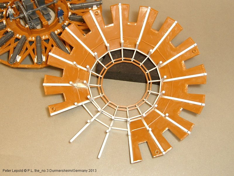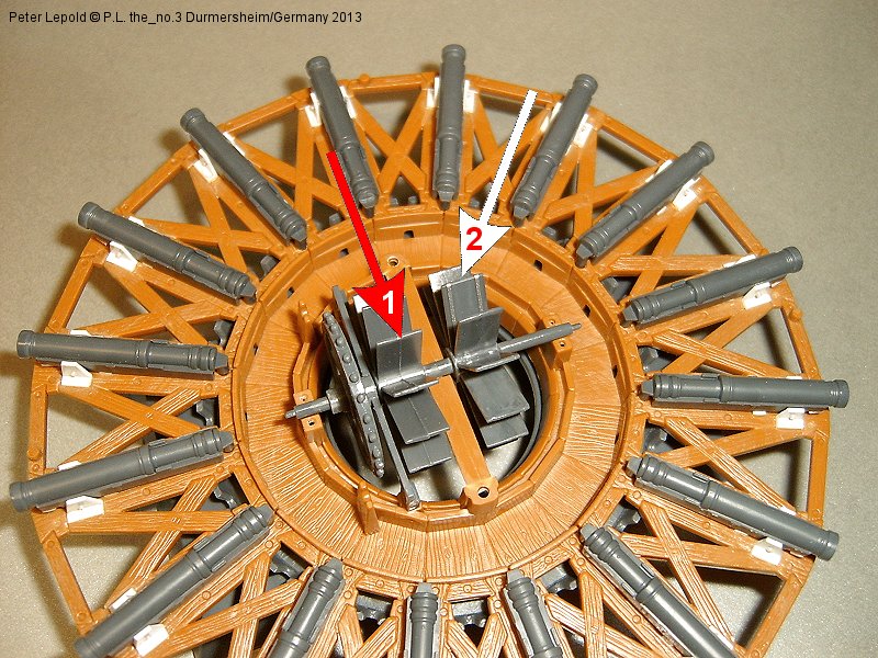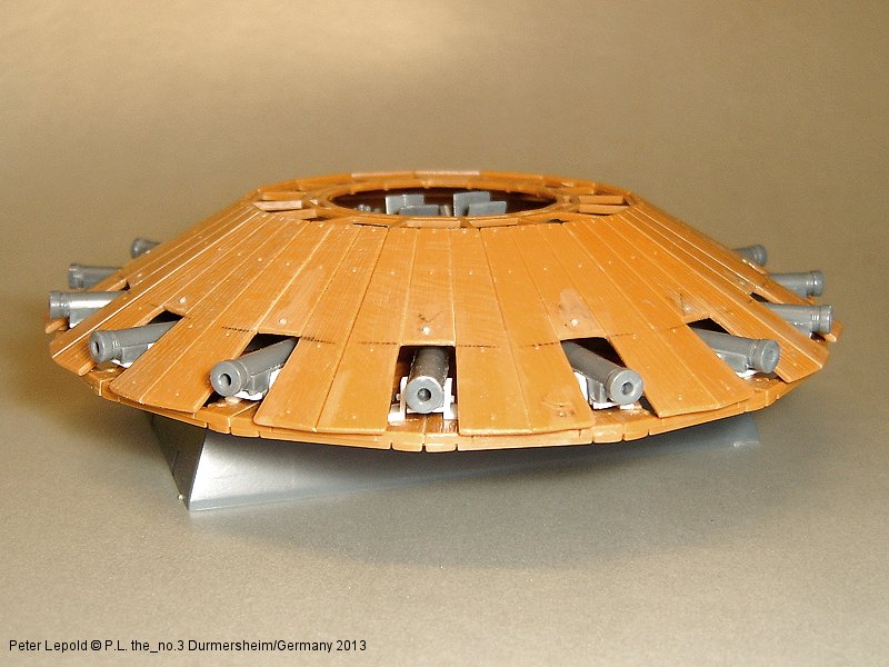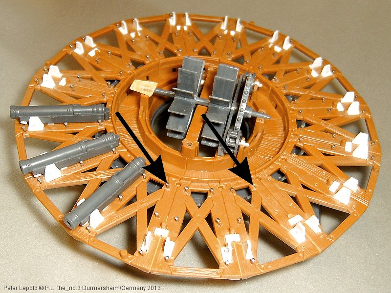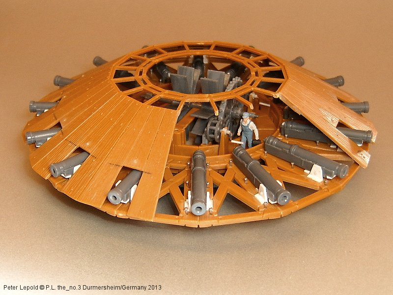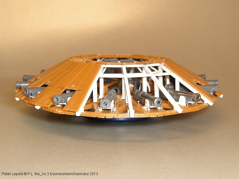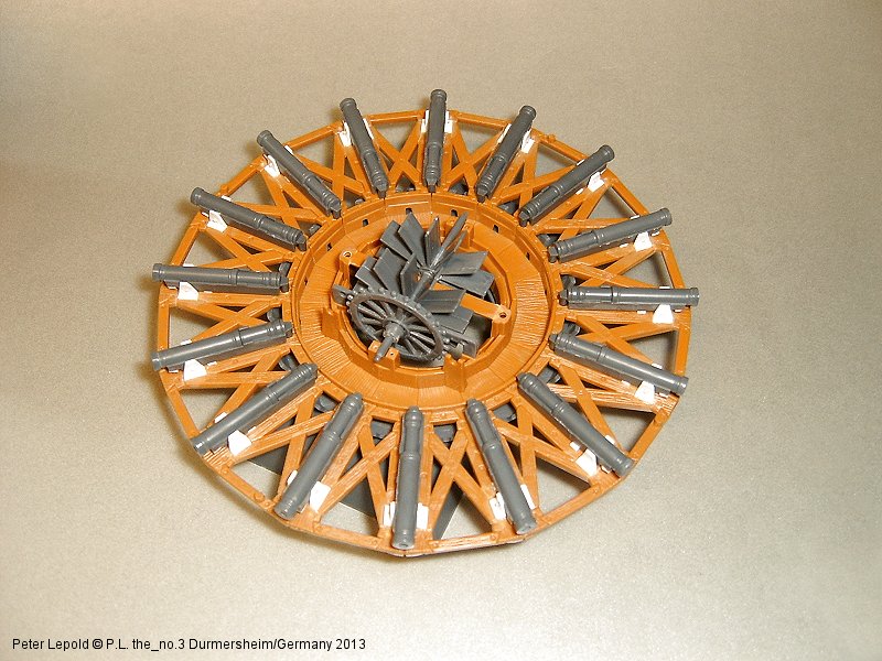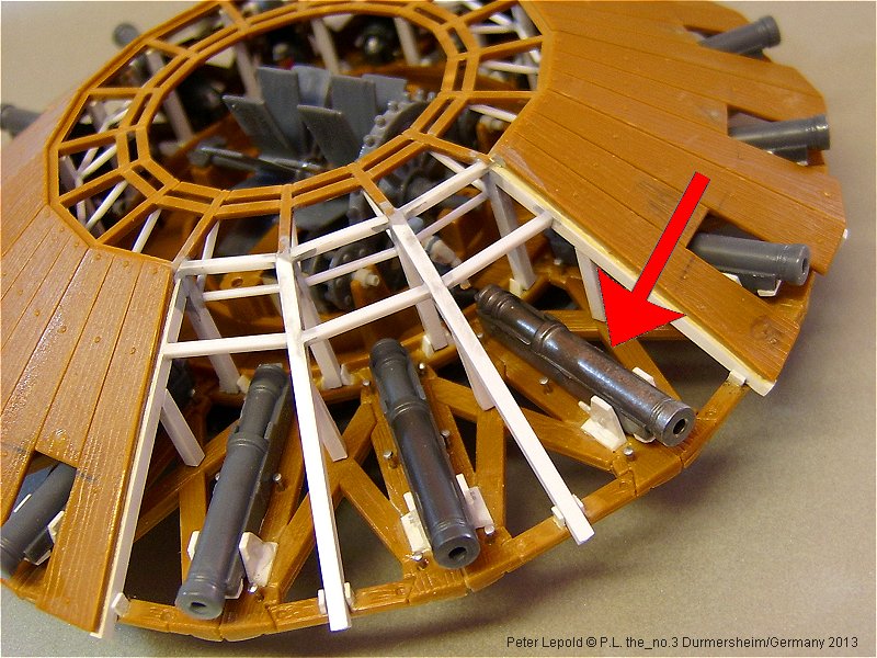 Als nächstes sieht man alle Kanonen mitsamt der Stützen zur Passprobe eingebaut;