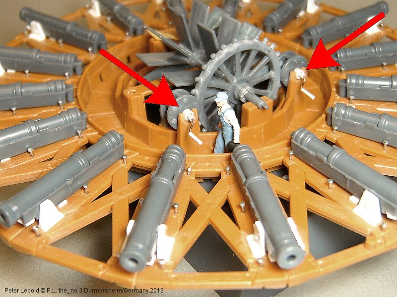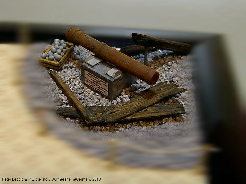 Zur Probe wurde eine der Kanonen schon mal farblich zu "Gusseisen" bemalt (Abbildung