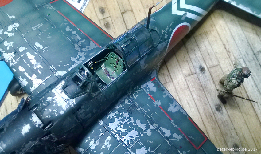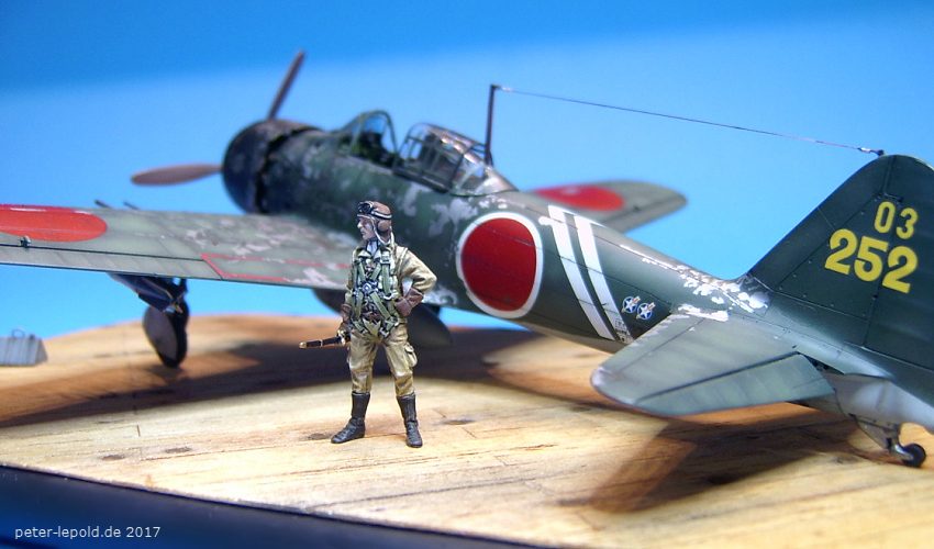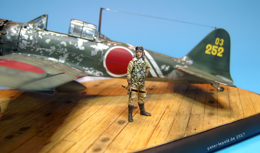 Pilotenfigur von Plus Model, "Flugzeugträgerdeck" aus Balsaholz gefertigt.