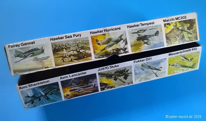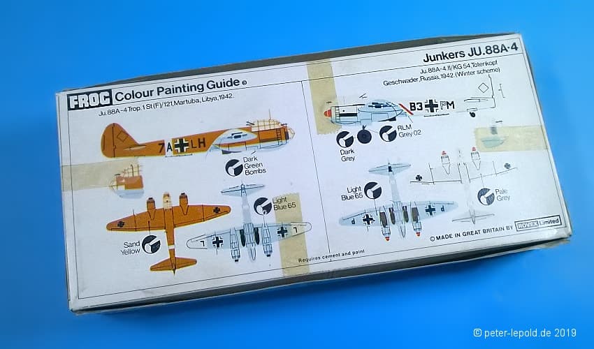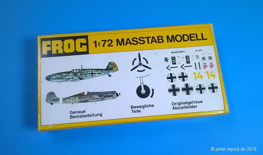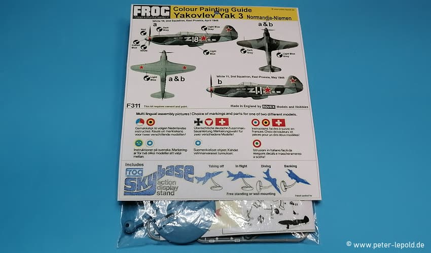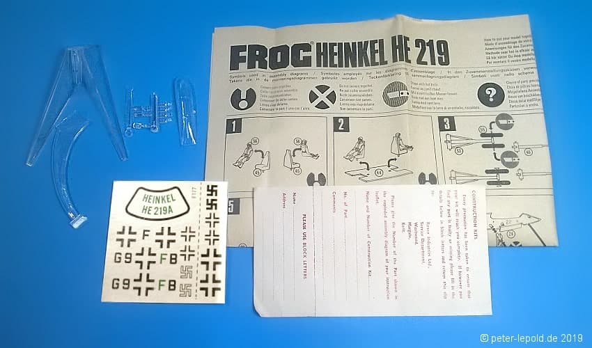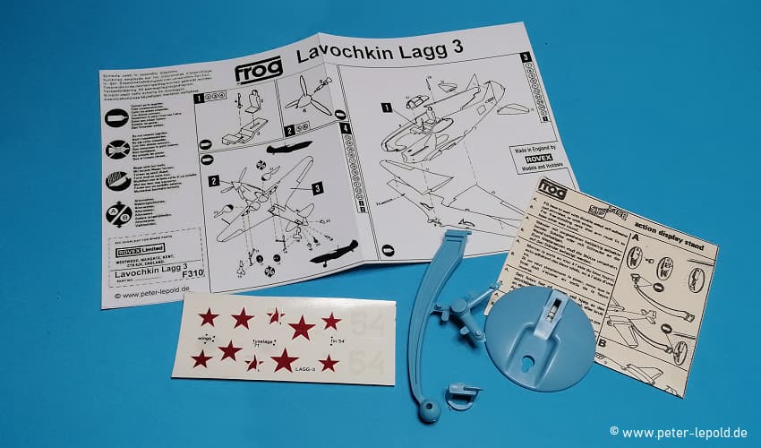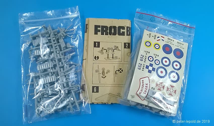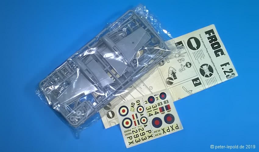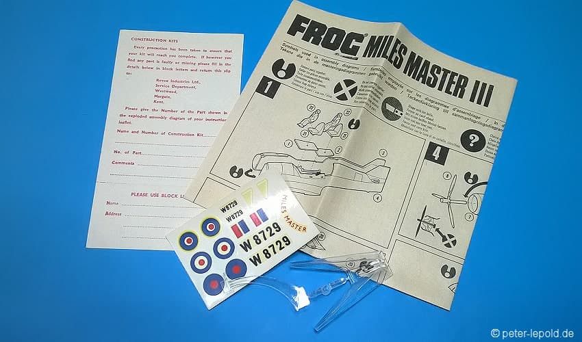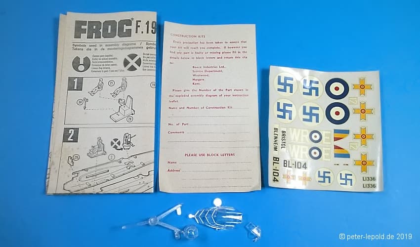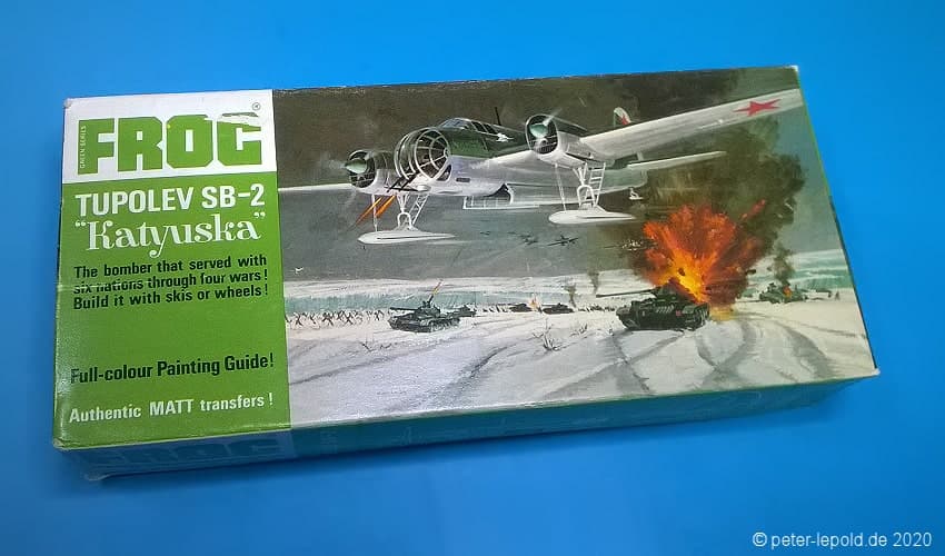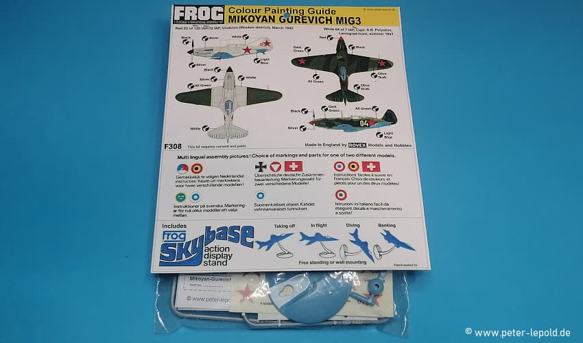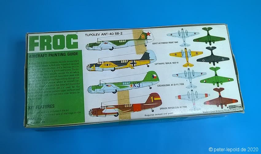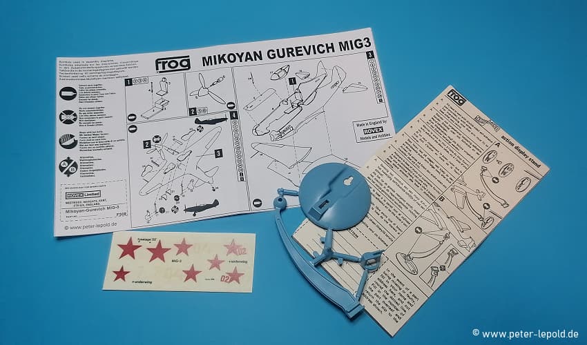 Dies sind KEINE realen FROG Verpackungen. Da das Modell wie erwähnt nicht mehr von FROG produziert wurde und es aus sowjetischer Produktion keine vernünftige Verpackung gibt, habe ich mir die Verpackungen (Schachteltyp H1 und Plastikbeutel Typ J2) sowie die ''FROG'' Baupläne selbst erstellt. Entsprechende Decals stammen vom Zubehörmarkt.