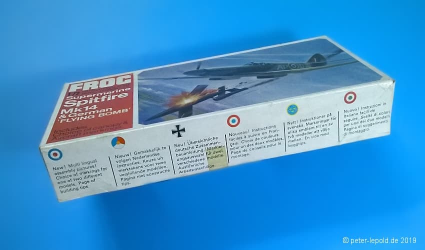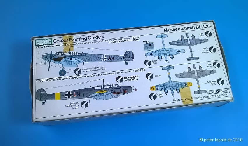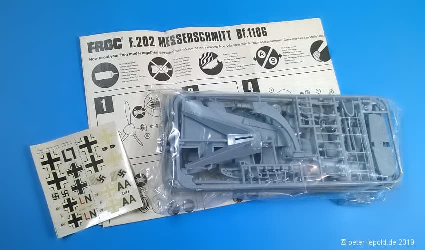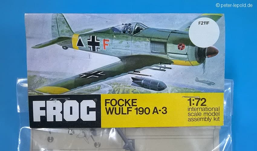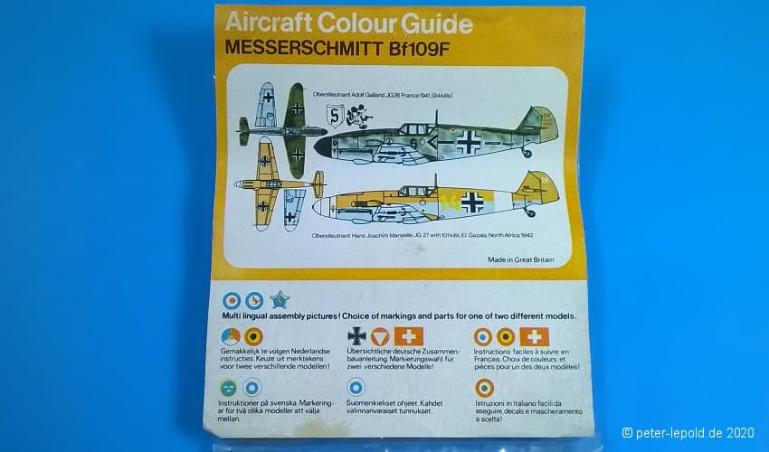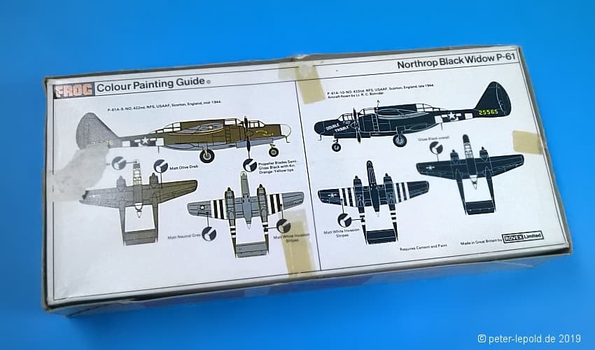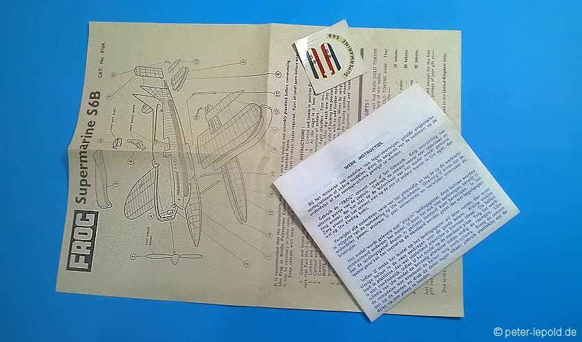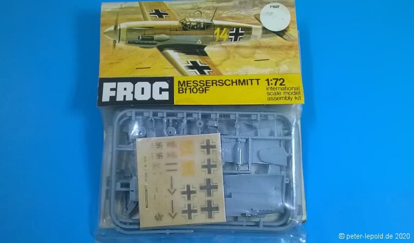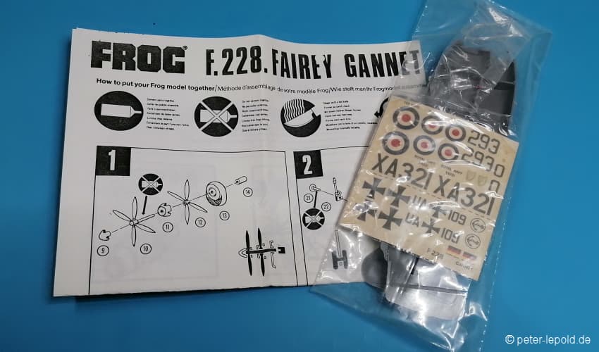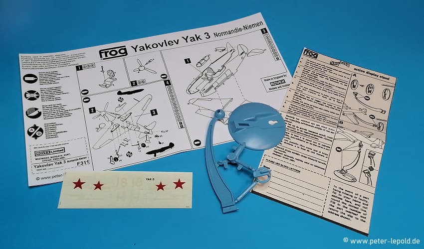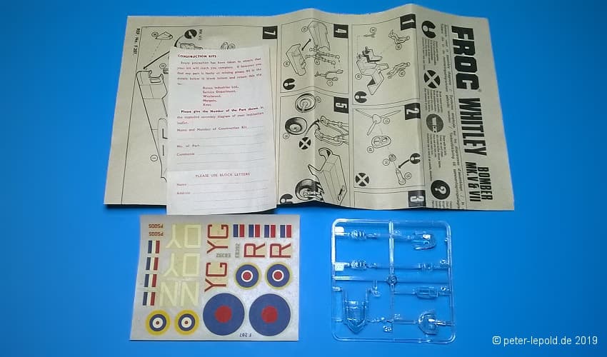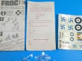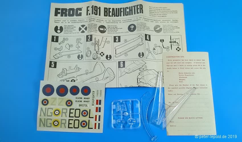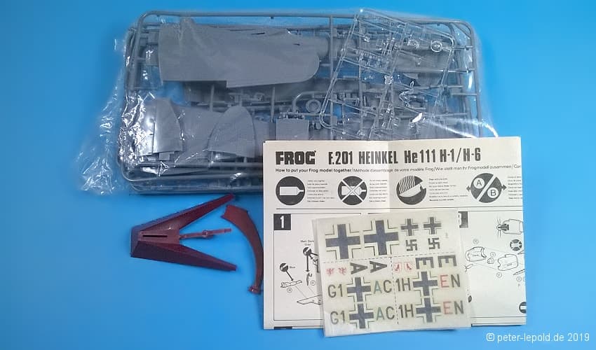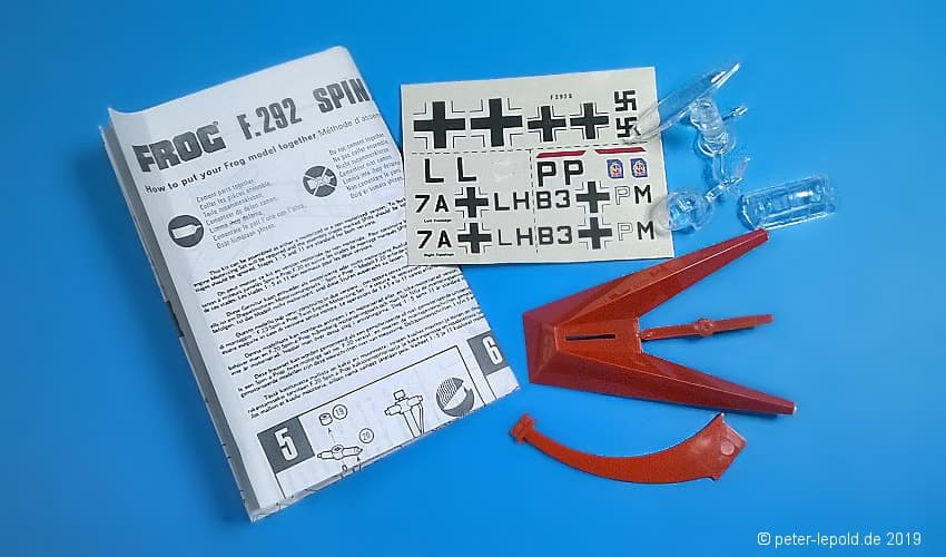 Dies sind KEINE realen FROG Verpackungen. Da das Modell wie erwähnt nicht mehr von FROG produziert wurde und es aus sowjetischer Produktion keine vernünftige Verpackung gibt, habe ich mir die Verpackungen (Schachteltyp H1 und Plastikbeutel Typ J2) sowie die ''FROG'' Baupläne selbst erstellt. Entsprechende Decals stammen vom Zubehörmarkt.