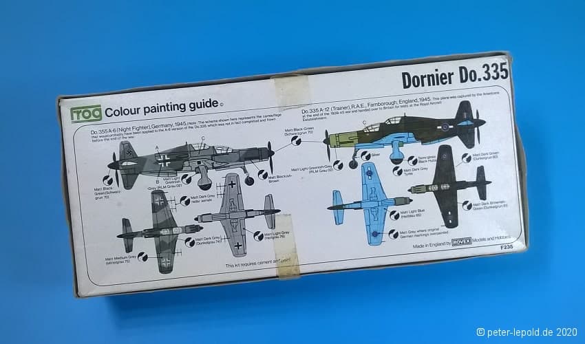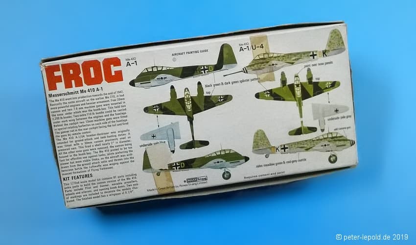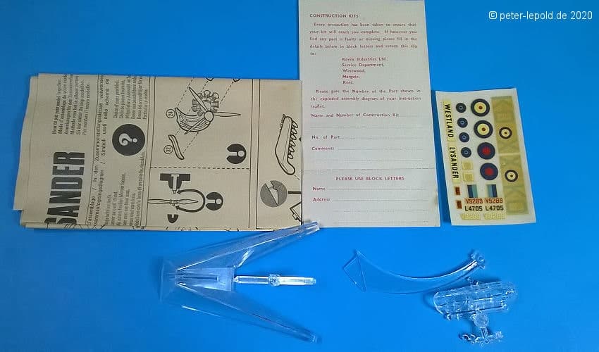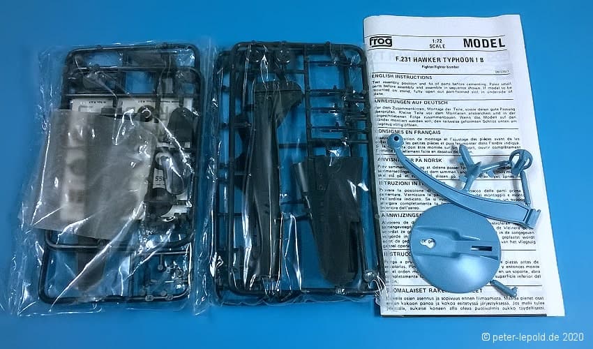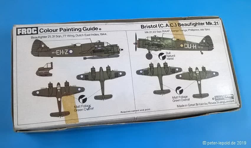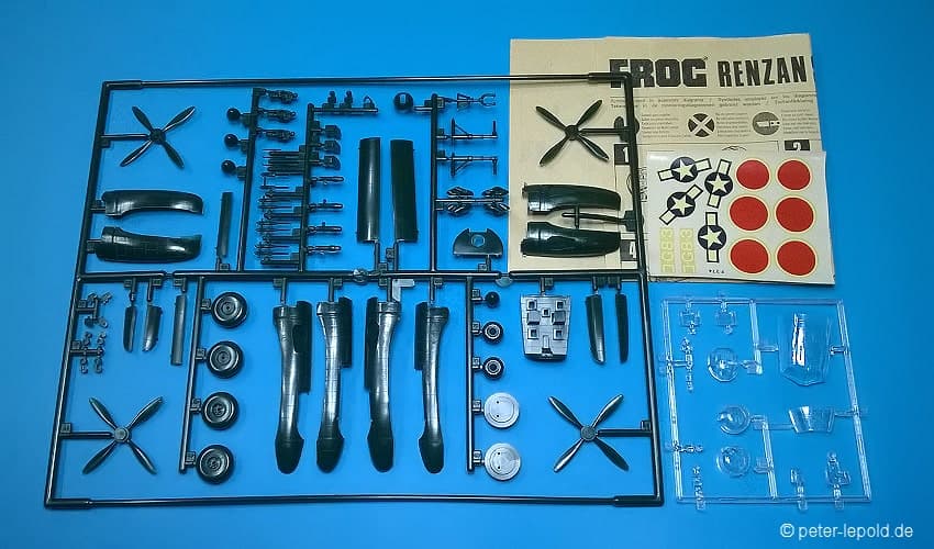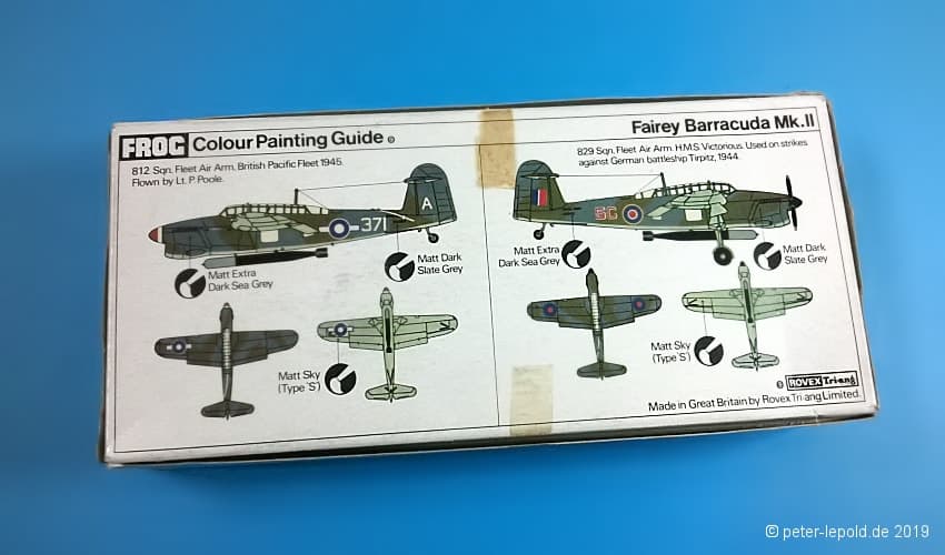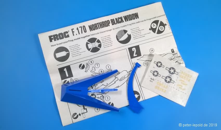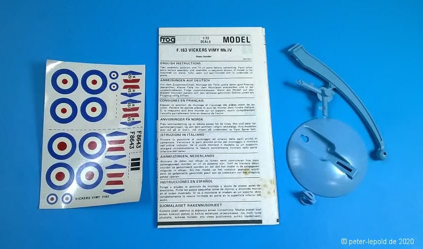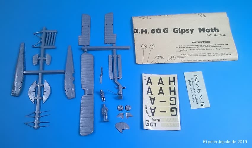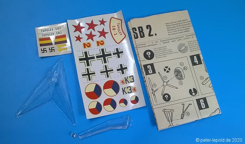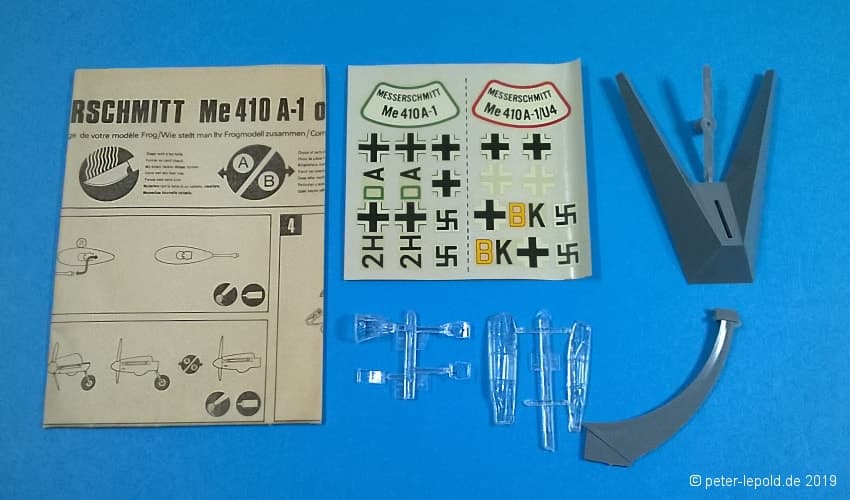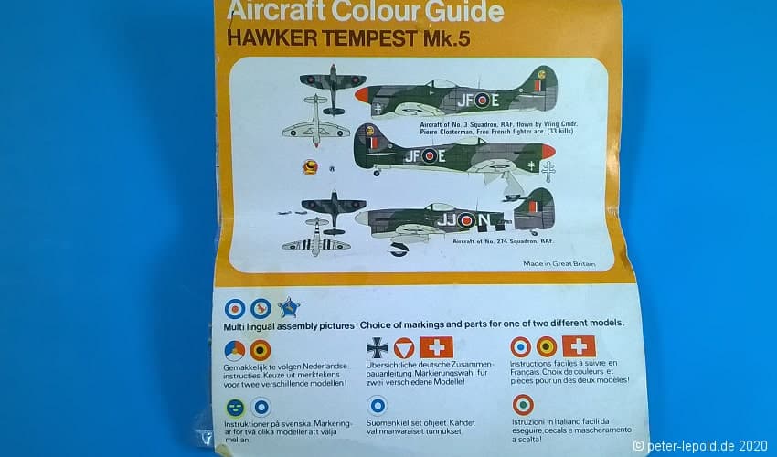 Dies sind KEINE realen FROG Verpackungen. Da das Modell wie erwähnt nicht mehr von FROG produziert wurde und es aus sowjetischer Produktion keine vernünftige Verpackung gibt, habe ich mir die Verpackungen (Schachteltyp H1 und Plastikbeutel Typ J2) sowie die ''FROG'' Baupläne selbst erstellt. Entsprechende Decals stammen vom Zubehörmarkt.