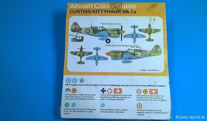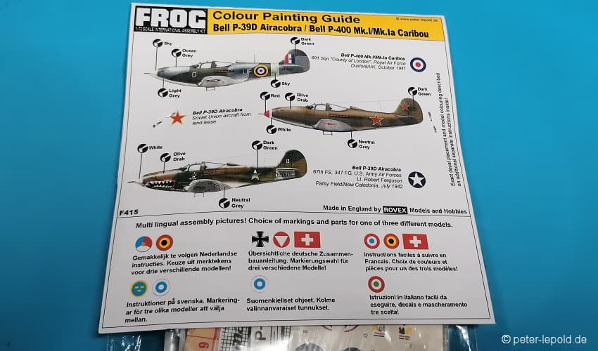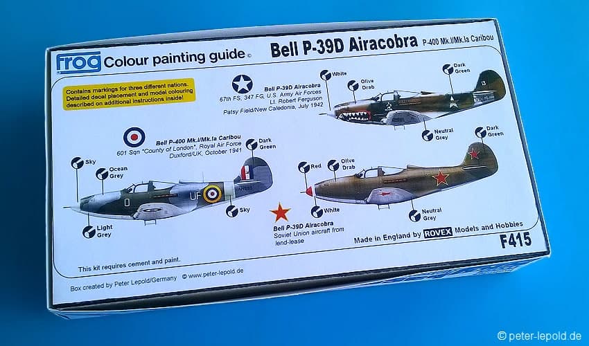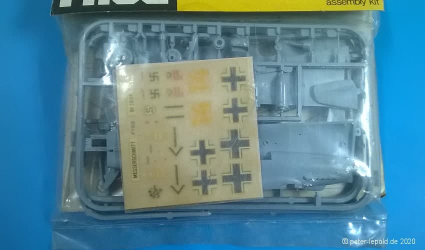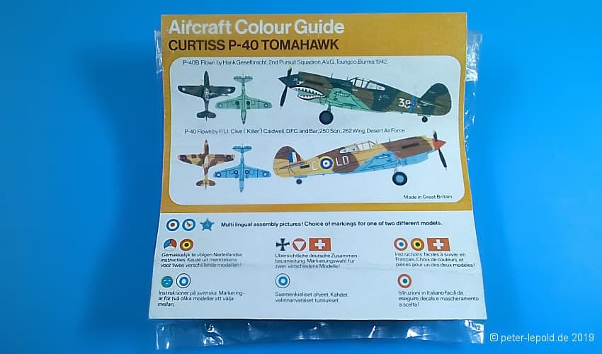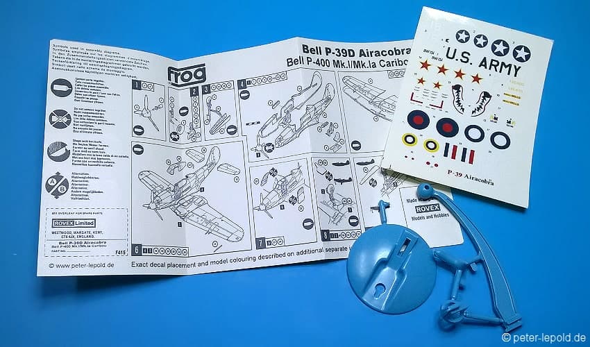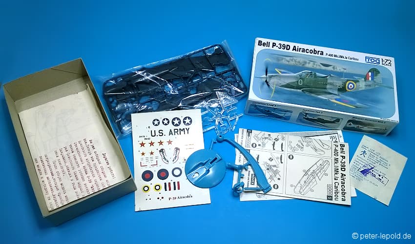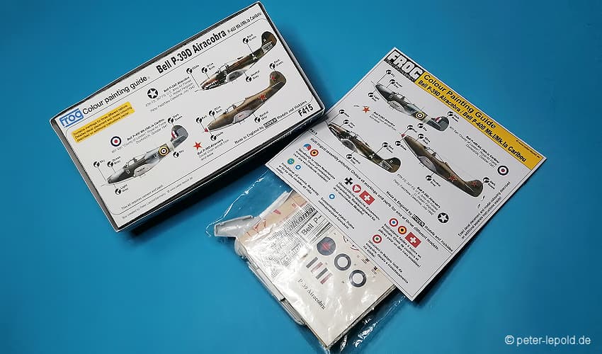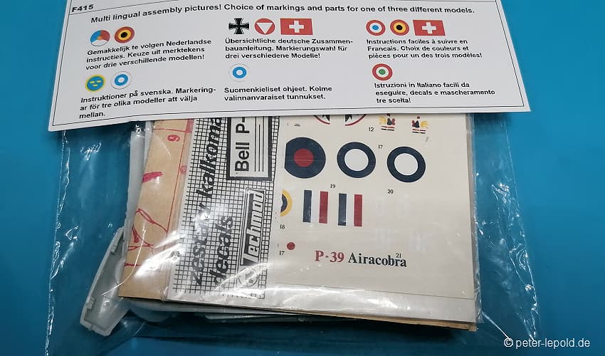 So waren damals und sind teilweise heute noch die P-39 Airacobra Bausätze erhältlich, lediglich in grässliche und mit der Zeit sich selbst auflösende Zellophantüten verpackt und fast immer ohne Decals. Der u.g. Bausatz stammt aus einer der seltensten ''BFI Sonderauflagen''.