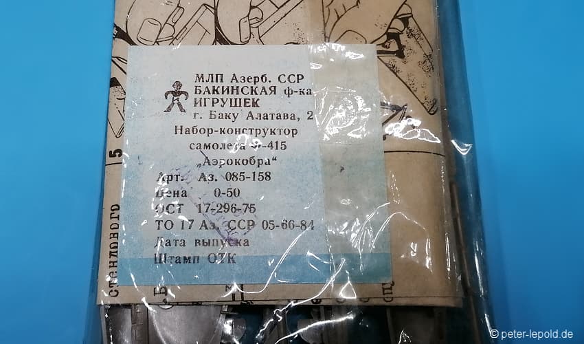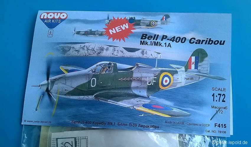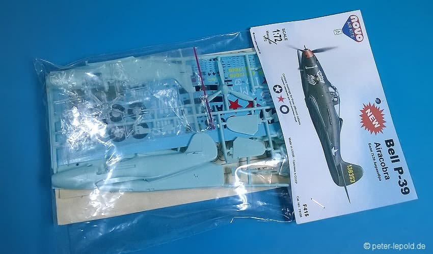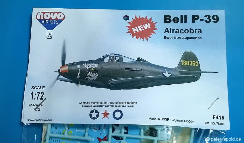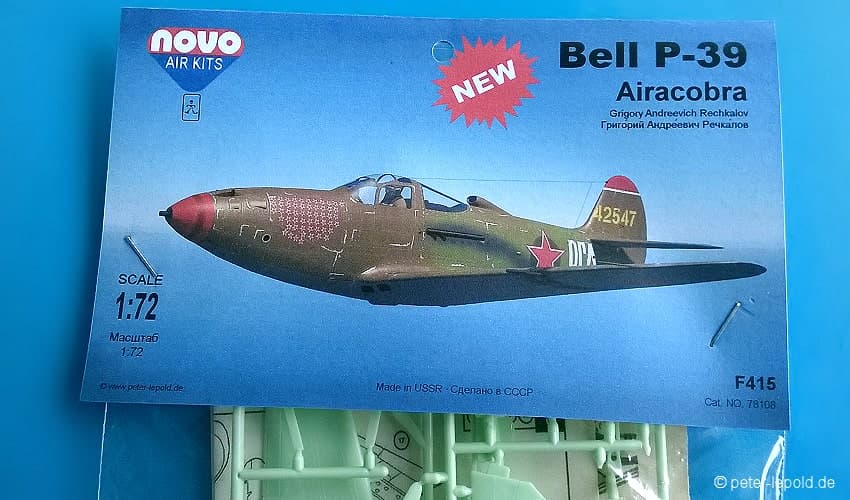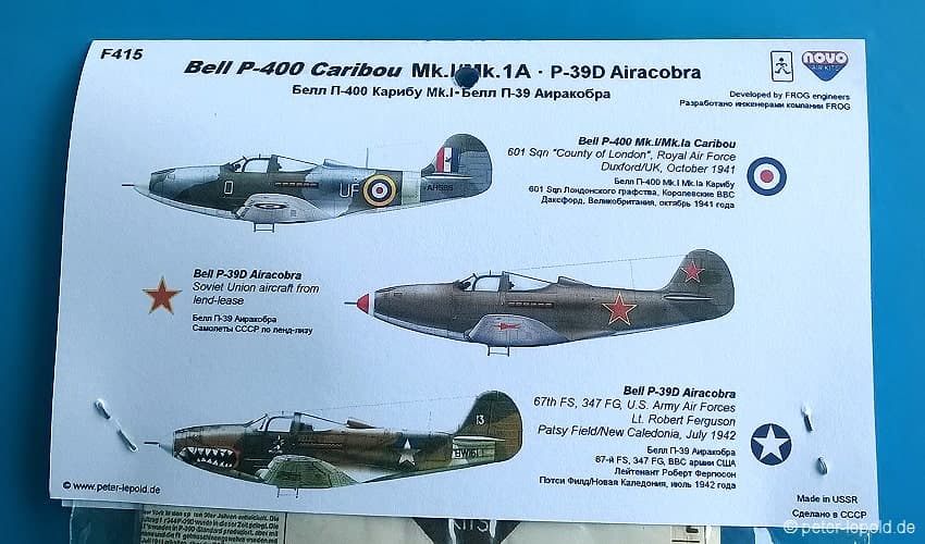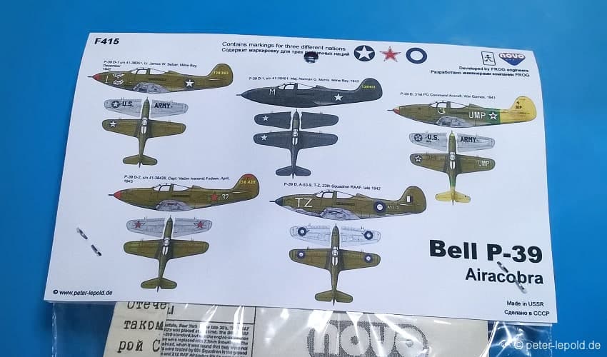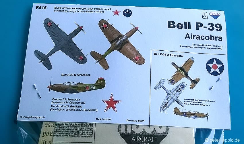 Formen stammen von FROG aus dem Jahr 1976 und hätte die Nummer F415 bekommen sollen, jedoch nur in geringer Stückzahl als Testshots in schwarzem Kunststoff produziert. Durch die Insolvenz 1977 von FROG nicht mehr realisiert. Die Form wurde in die Sowjetunion verkauft und bei BFI Spielzeugfabrik Baku Aserbaidschan SSR (БФИ Бакинская фабрика игрушек Баку АзССР) produziert. NOVO hatte offenbar mit der Produktion, dem Vertrieb etc. nichts mehr zu tun. Ich habe mir Verpackungen dazu erstellt wie es aussehen hätte können, wenn NOVO das Modell noch vertrieben hätte. Zum Verbleib der Formen gibt es kaum Informationen. Derzeit gibt es Gründe zur Annahme, dass das Werkzeug in den frühen 90er Jahren leider verschrottet wurde. Ausführliche Infos zum Airacobra Modell hier.