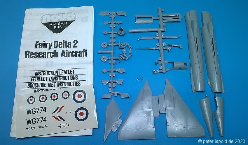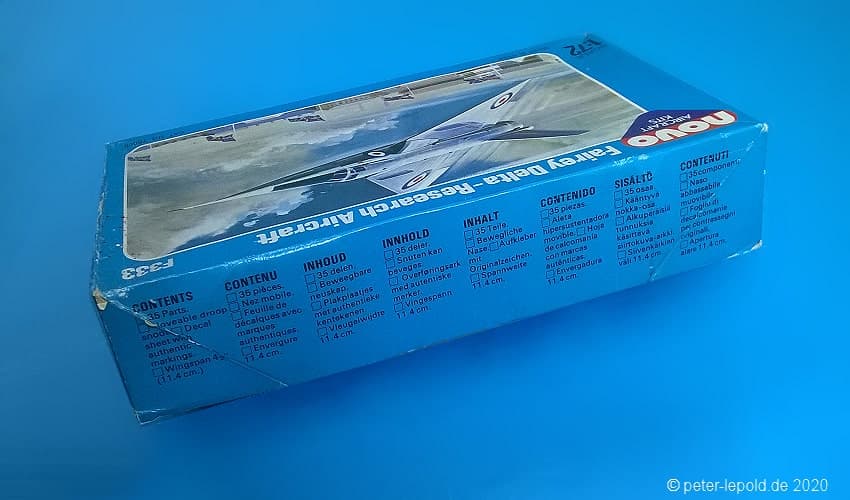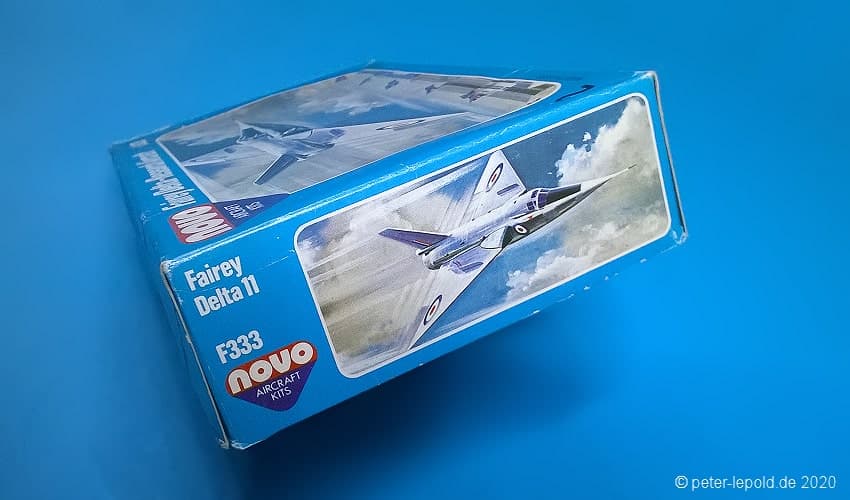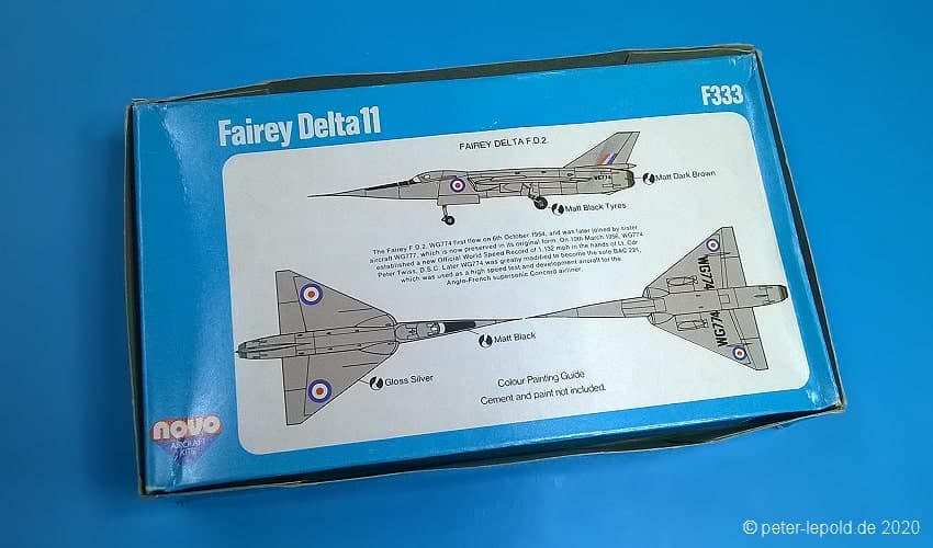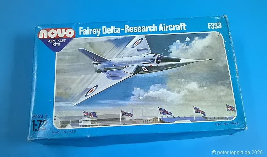 Fairey Delta-Research AircraftFairey Delta FD-2 #F333 (auch als #76058 gelistet) aus 1977/78 (Erste Auflage 1957 von Frog als Fairey F.D.2 mit #333P) Maßstab 1:72, 35 Teile Die im Jahr 1964 vergebene FROG Nummer ''F333'' sowie die Boxart wurden von NOVO zunächst unverändert übernommen (im NOVO Katalog erhielt das Modell den Index 76058). Auf der Rückseite der Schachtel wurde das Modell fälschlicherweise als ''Fairey Delta 11'' bezeichnet. Der Grund lag darin, dass die englische Schreibweise mit der römischen Ziffer II in Russland als eine doppelte 1 interpretiert wurde und so aus der ''II'' eine ''11'' wurde. Die Gußform der Fairey Delta war eine der ersten FROG-Formen, die nach der Insolvenz 1977 von FROG in die Sowjetunion geliefert wurde. Produziert wurde das Modell anfänglich im Kunststoffwerk Naro-Fominsk bei Moskau. Wo sich die Form z.Z. befindet, wie der Zustand ist und ob dieses seltene Modell jemals wieder in den Handel kommt ist unbekannt. Ausführliche Infos zum Fairey Delta Modell hier.