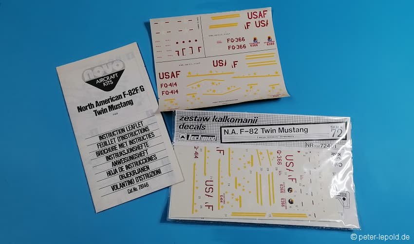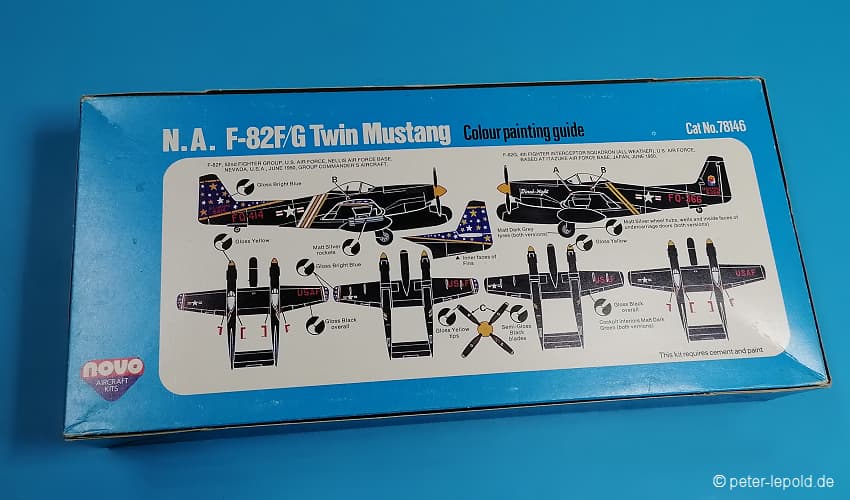Mustang-Night FighterNorth American F-82F (NA.149)/F-82G (NA.150) Twin Mustang #F405 (auch als #78146 gelistet) aus 1980 Maßstab 1:72, 69 Teile Formen stammen von FROG aus dem Jahr 1976 und hätte die Nummer F405 bekommen sollen, jedoch wurden nur ca. 50 Stück als Testshots produziert. Durch die Insolvenz 1977 von FROG nicht mehr realisiert. Die Gußform wurde Ende 1977 in die Sowjetunion überführt und die Modelle zunächst bis ca. 1993 bei BFI Spielzeugfabrik Baku Aserbaidschan SSR (БФИ Бакинская фабрика игрушек Баку АзССР) produziert und von NOVO vertrieben. Zum Verbleib der Formen gibt es keine verlässlichen Informationen. Derzeit gibt es Gründe zur Annahme, dass das Werkzeug leider verschrottet wurde. Ausführliche Infos zum Twin-Mustang Modell hier.