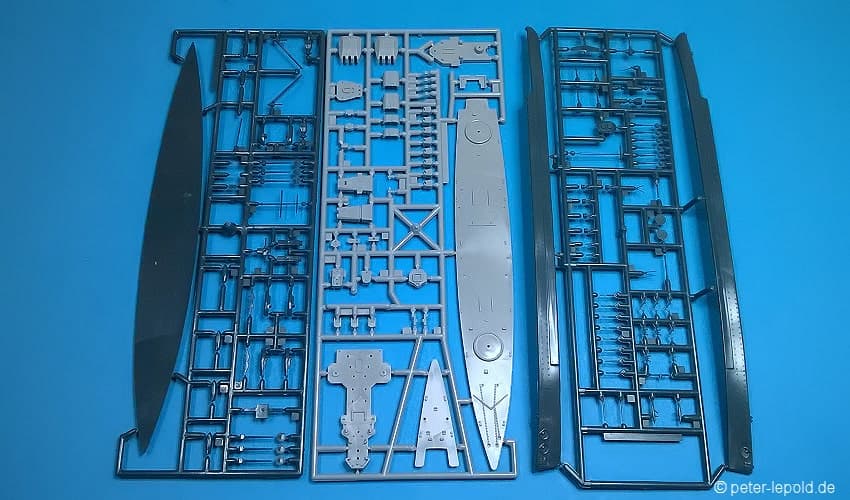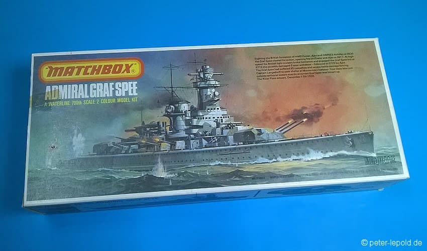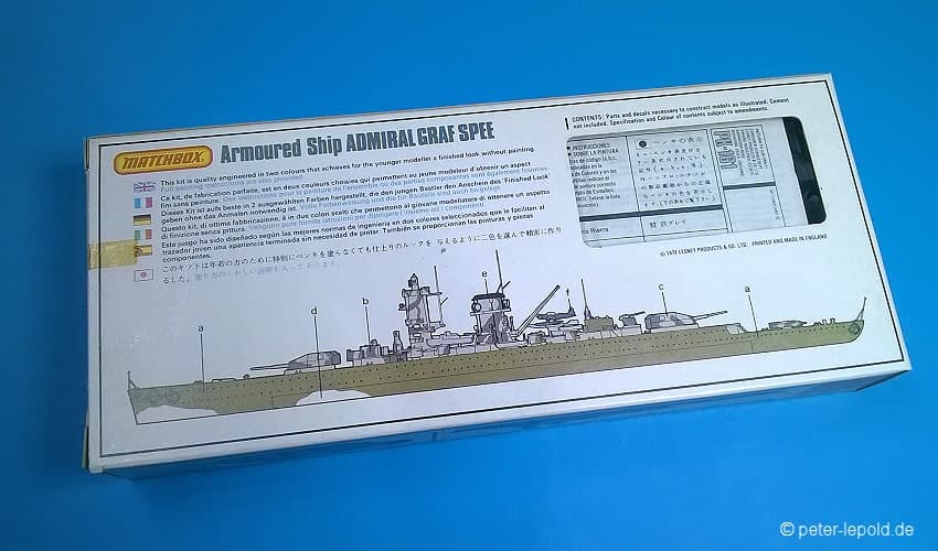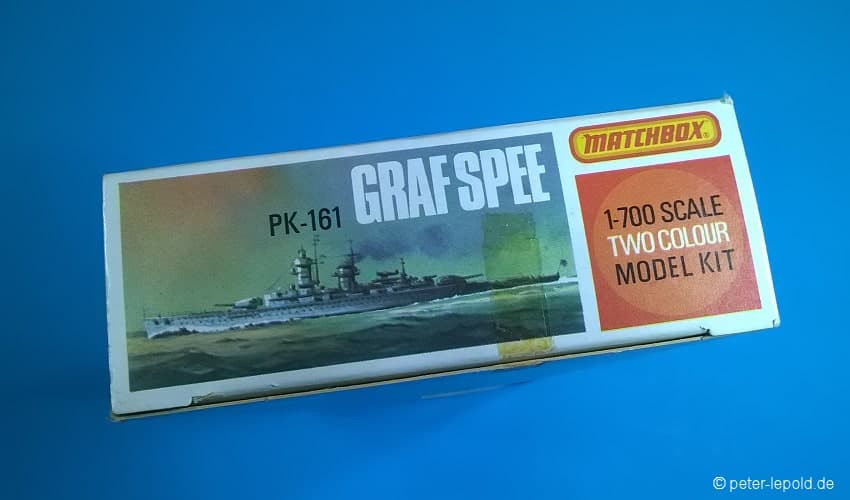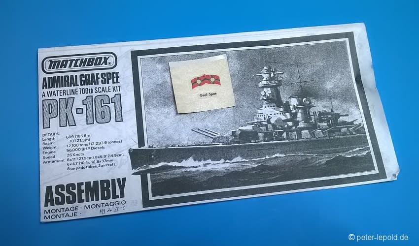 Admiral Graf Spee Panzerschiff Admiral Graf Spee (Deutschland-Klasse) #PK-161 von 1977 (Erste Auflage) Orangene Serie, Schachteltyp 3 mit Sichtfenster Maßstab 1:700, 128 Teile in zwei Farben