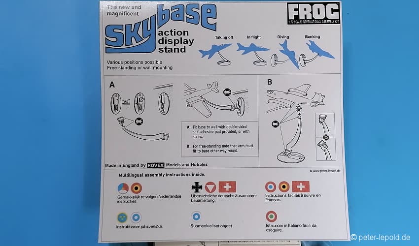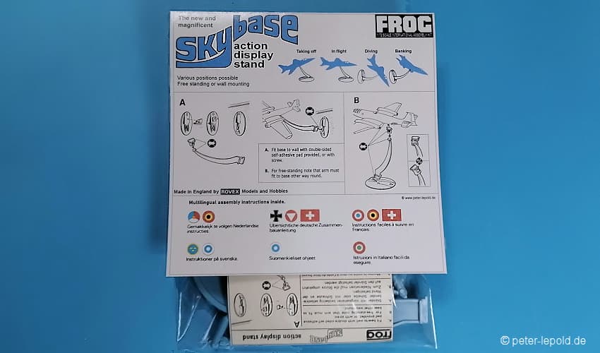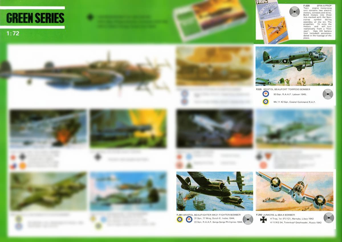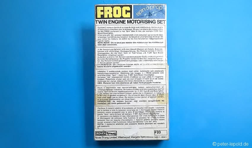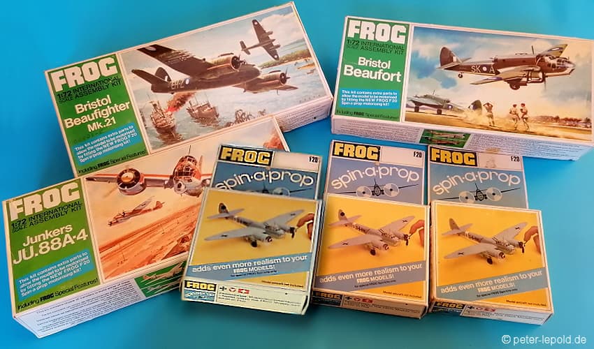 Bereits in den 1930er Jahren fertigte das Unternehmen "FROG Penguin" Flugzeugmodelle aus Cellulose-Acetat im Maßstab 1:72...und im Prinzip liegt der Ursprung des Plastikmodellbau in Großbritannien...genauer gesagt bei FROG. In Frankreich wurden diese Bausätze aufgrund kultureller Bedenken gegenüber dem Wort "Frosch" unter der Marke "Tri-ang" vermarktet, während in Nordamerika aus ähnlichen Gründen der Name "Frosch" als inakzeptabel angesehen wurde und die Bausätze unter dem Namen "Air Lines" neu verpackt wurden (eine Anspielung auf Lines Brothers Ltd, die Gründer von IMA/Tri-ang). Ab ca. 1977 wurden fast alle FROG Werkzeuge nach der Insolvenz von FROG in verschiedene Fabriken in der Sowjetunion überführt und viele Bausätze kamen unter dem Namen "NOVO" wieder auf den Markt sowie die letzten Neuentwicklungen unter dem Label "RED STAR". Lediglich die Flugzeugmodelle der Achsenmächte (deutsche, italienische und japanische Modelle) wurden von Revell übernommen, welche die sowjetische Seite ''freundlicherweise'' ablehnte..! Mehr zum Thema FROG und NOVO auf den Seiten FROG Chronology, FROG Info und NOVO Info.